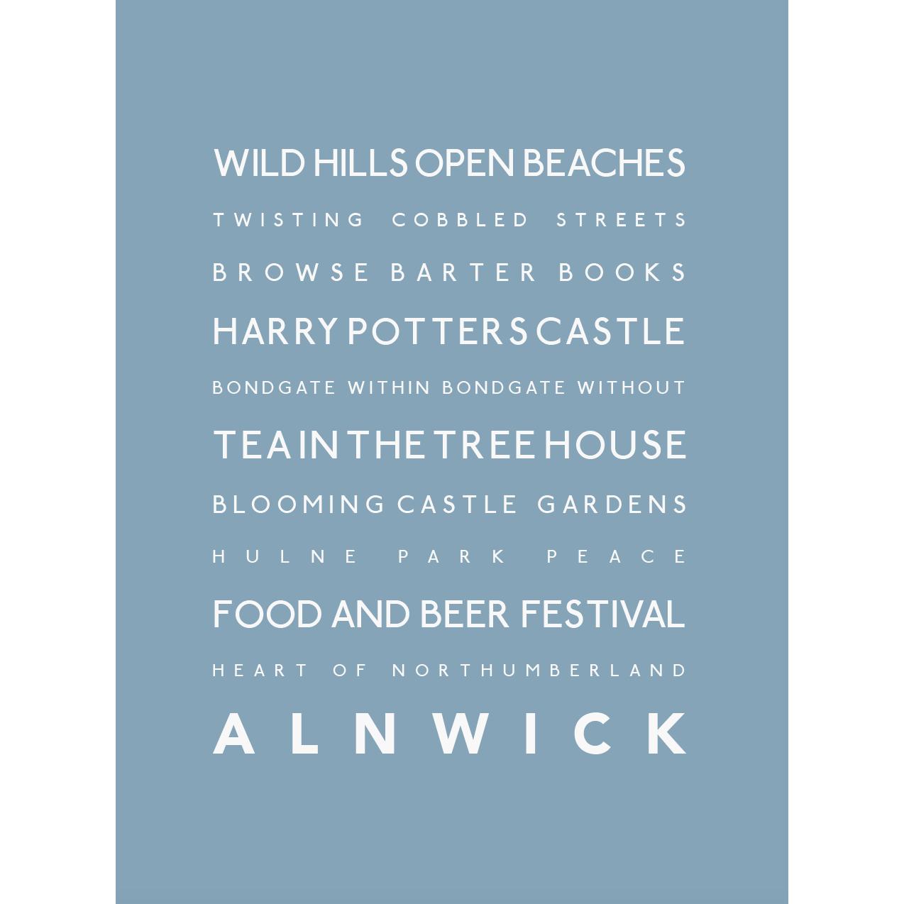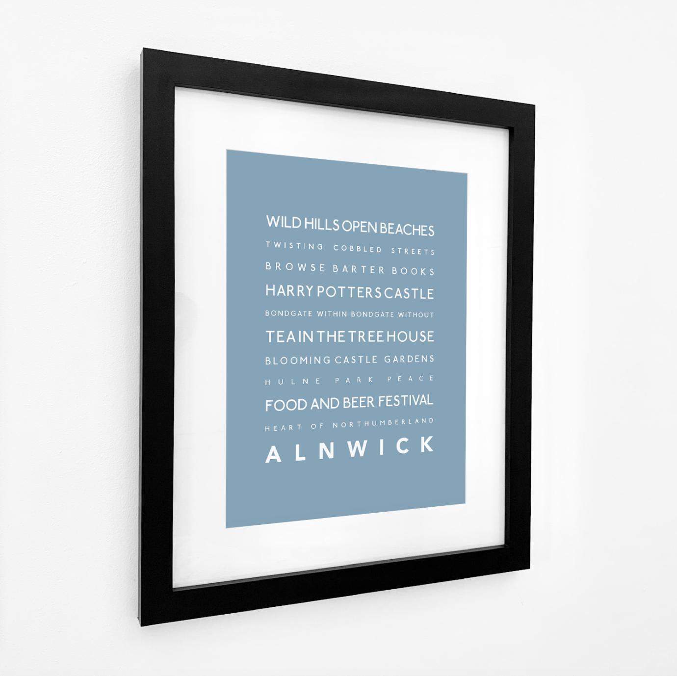 This Alnwick Typographic Travel Print- Coastal Wall Art is available in three sizes: